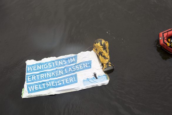 Mit einem schwimmenden, überdimensionalen WM Pokal, sowie einem Banner mit der Aufschrift „Wenigstens im Ertrinken lassen Weltmeister“ protestieren heute Morgen (11.07.2018) mehrere Sea-Watch Aktivist*innen auf der Süderelbe gegen die Untätigkeit der Bundesregierung das Sterben auf dem Mittelmeer zu beenden sowie gegen die Blockade ziviler Rettungskräfte, für die sich auch Innenminister Seehofer einsetzt. Zeitgleich blockieren Aktivist*innen…