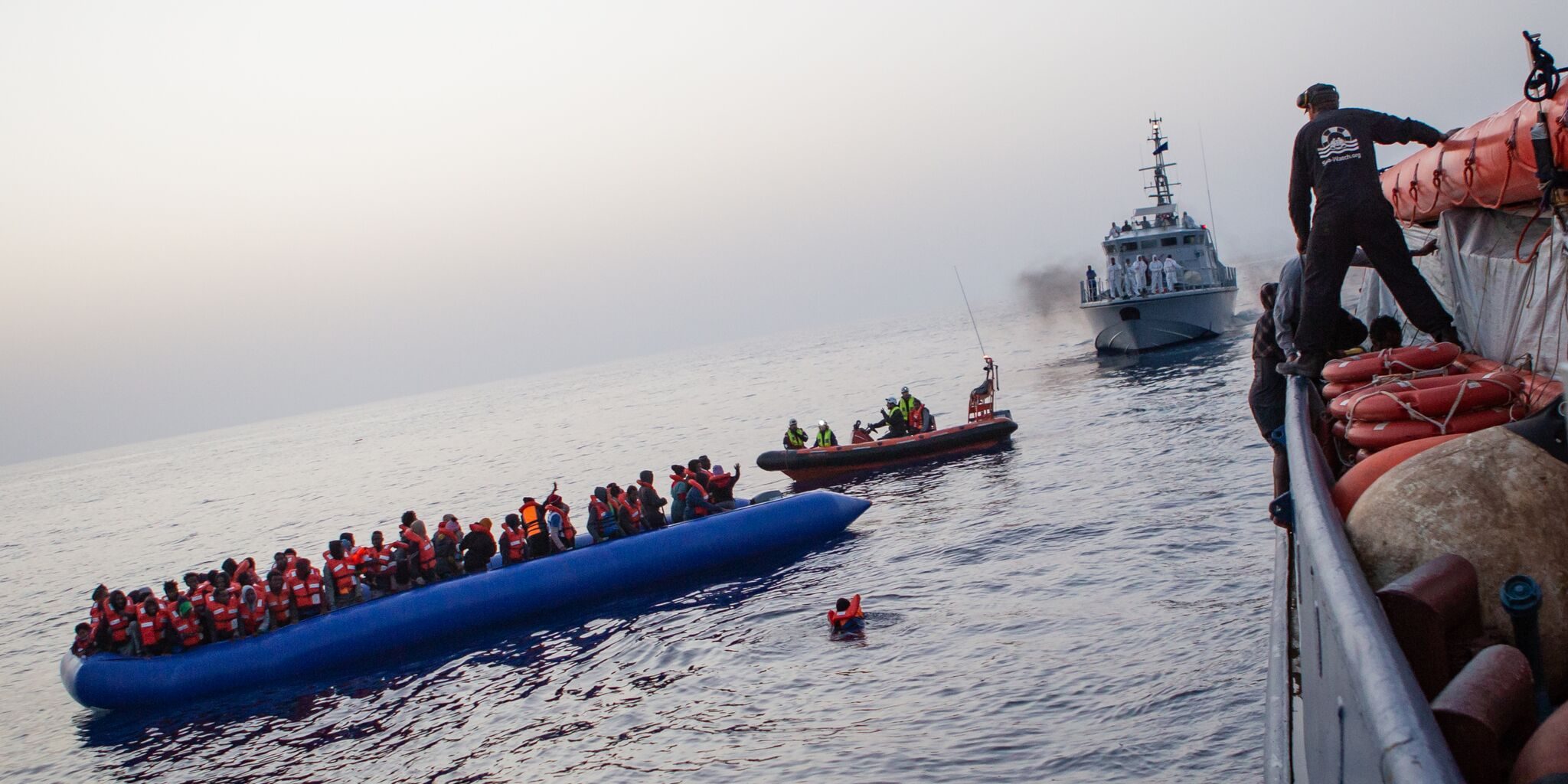 Das blaue Schlauchboot, eine Person ist noch im Wasser. Im Hintergrund unser RHIB und die sogenannte „Libysche Küstenwache“. · Photo: Tim Lüdemann / Sea-Watch e.V.