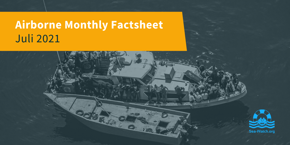 This factsheet outlines a summary of the distress cases witnessed in July 2021 by Sea-Watch’s Airborne crews from their two aircraft Moonbird and Seabird.* In July 2021 we conducted 19 operations, with a total flight time of 114 hours and 54 minutes. We spotted around 1.517 persons in distress aboard 38 different boats.
