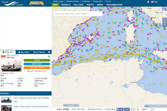 The Sea Watch vessel left the Port of Carboneras on 6 June. She is expected to arrive in Lampedusa on or around the 15 June (AGW) with preparations on the Island continuing in anticipation of her imminent arrival. (Copyright screenshot = vesselfinder.com)