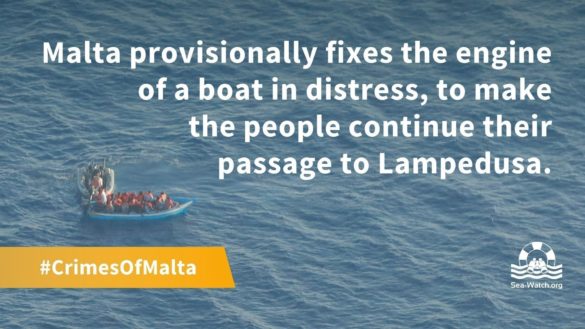 #CrimesOfMalta: A boat in distress is apparently supplied with 64 life jackets by the Maltese armed forces and then left alone – Malta shows itself once again from its most inhuman side: instead of rescuing, they only distribute life jackets. 29.08.2020: Our Moonbird spots a completely overloaded wooden boat in the Maltese Search and Rescue…