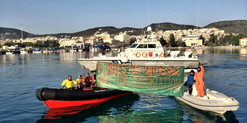 Today morning, a protest of CADUS / Sea-Watch amongst other SAR organisations took place in the harbour of Lesbos capital Mytilini, from which deportations to turkey are taking place since today. This led to a bizarre situation, when our crew had drive to a rescue case while refugees got deported with a ferry. “People are escaping war and other threads in their countries of origin, it is foolish to believe they could be stopped by fences and deportations”, CADUS / Sea-Watch project leader Sebastian Jünemann says.