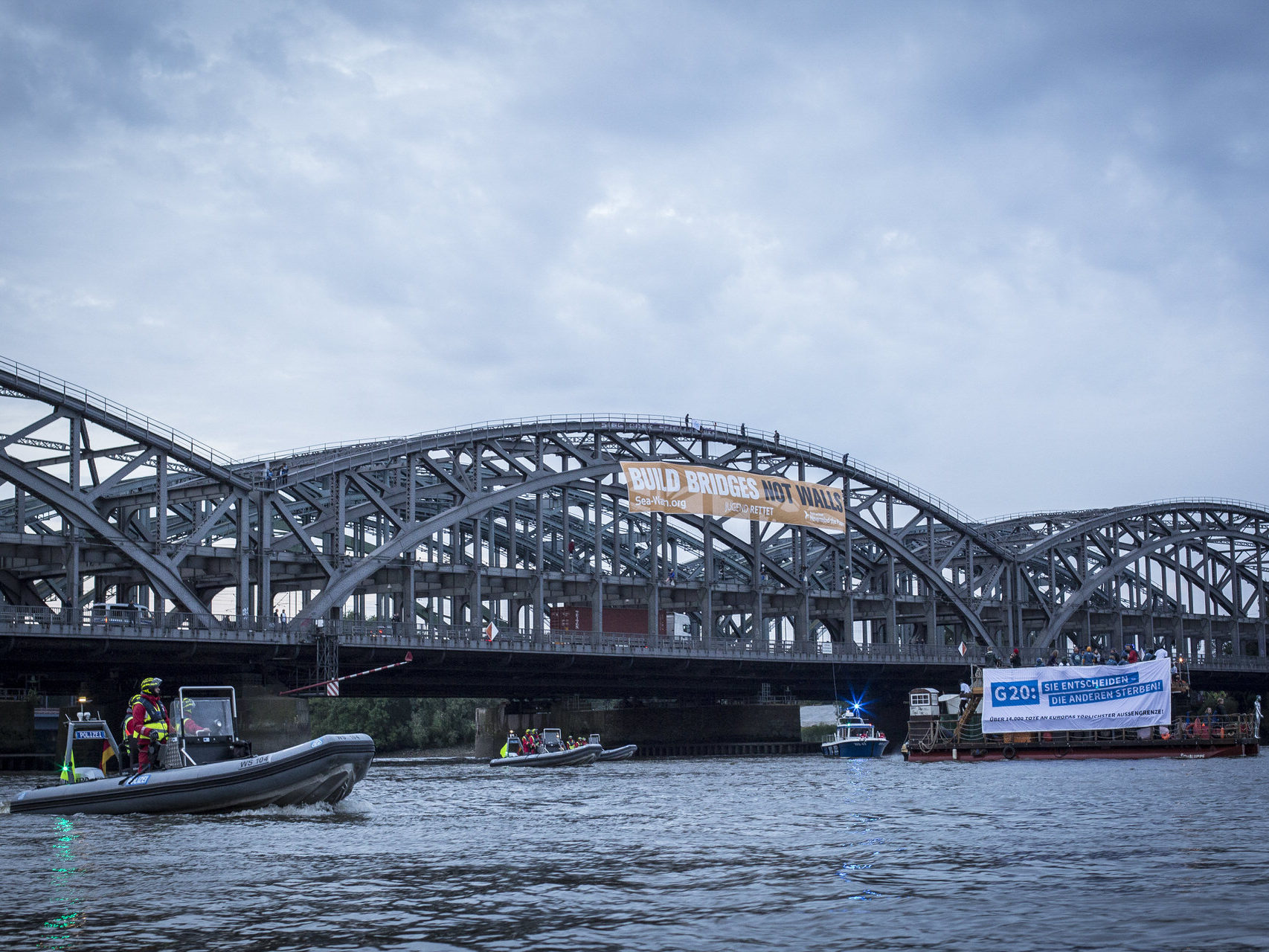 Mehr als 30 Aktivist*innen von Sea-Watch, Jugend Rettet und Never mind the papers, protestieren im Vorfeld des Gipfels mit einer spektakulären Kletteraktion an den Elbbrücken, für eine Wende in der Migrationspolitik der G20. „BUILD BRIDGES NOT WALLS“ steht auf einem gut 140m2 großen Banner, welches 7 Kletter*innen an der Freihafen Elbbrücke entrollt haben. „Über 14.000…