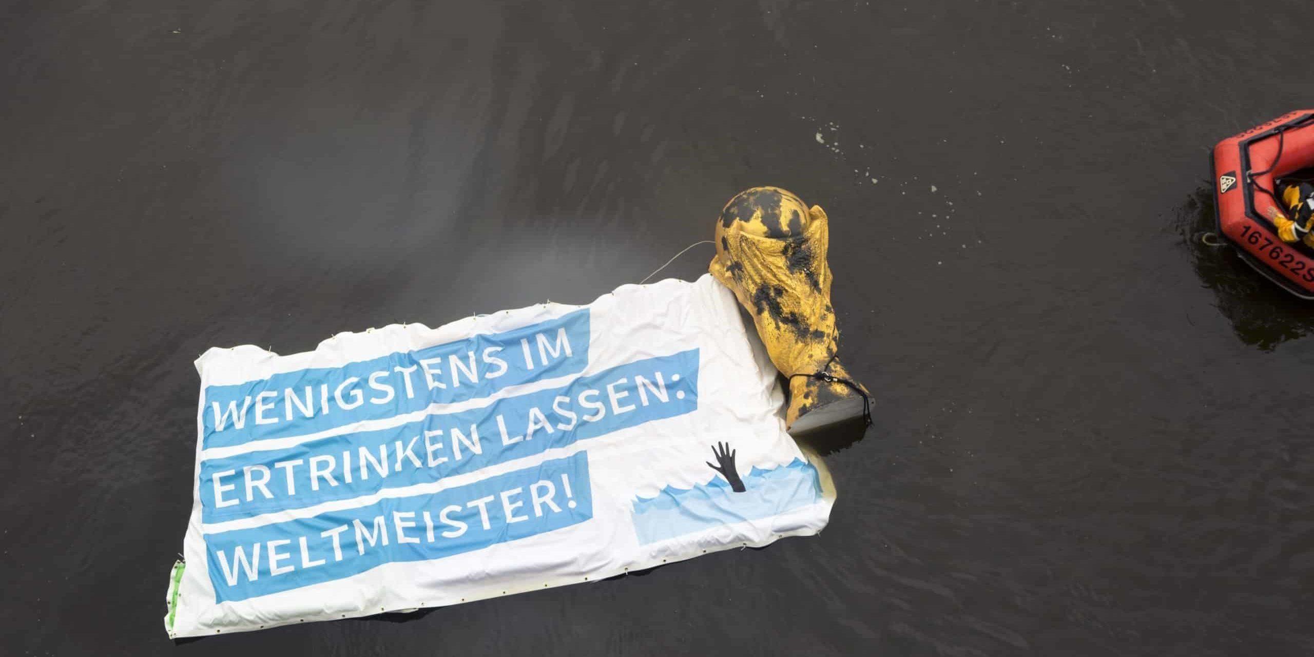 Mit einem schwimmenden, überdimensionalen WM Pokal, sowie einem Banner mit der Aufschrift „Wenigstens im Ertrinken lassen Weltmeister“ protestieren heute Morgen (11.07.2018) mehrere Sea-Watch Aktivist*innen auf der Süderelbe gegen die Untätigkeit der Bundesregierung das Sterben auf dem Mittelmeer zu beenden sowie gegen die Blockade ziviler Rettungskräfte, für die sich auch Innenminister Seehofer einsetzt.